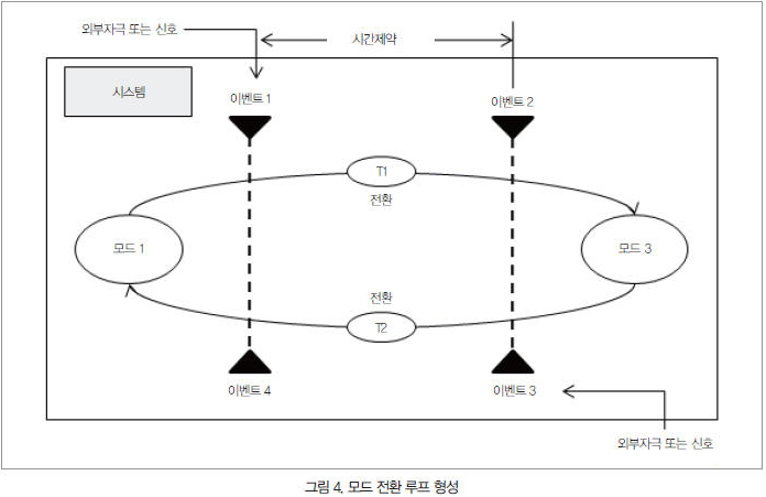 그림 4는 시작 이벤트 1이 발생할 때 모드 1로부터 모드 2로, 시작 이벤트 2에서 모드 2로부터 모드 1로 되돌아갈 때 전환하는 간단한 두 개의 모드 시스템에 관한 사례를 보여주고 있다. 모드 1로부터 모드 2 및 모드 1로 되돌아가는 시작 이벤트 전환은 서로 다른 가정과 조건 세트를 요구한다.
