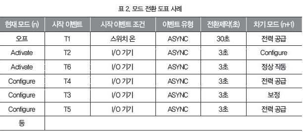 당신이 개념적인 시스템 단계와 모드를 설정하고 나면 다음 단계는 모드 전환을 위한 시작 이벤트와 조건을 제시하는 것이다. 이를 달성하는 한 방법은 표 2에 나타난 모드 전환 도표를 사용하는 길이다.