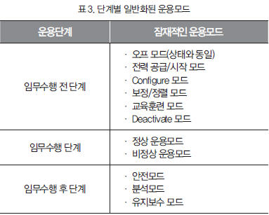 표 3은 이러한 공통 운용모드 목록을 제공하고 있다. 나아가 이러한 모드는 상호 의존적 관계를 맺고 있음을 분석할 수 있다.