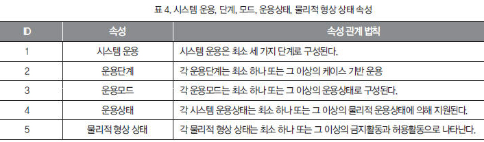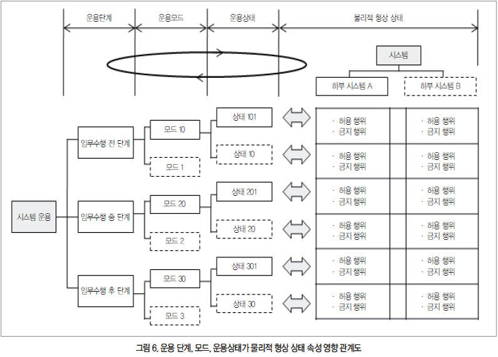시스템 단계, 모드, 상태에 관하여 좀 더 자세히 알아보기 위해 그림 1에 나타난 속성 관계 구조를 사용해 보도록 하자. 그림 1과 같은 절차는 시스템 복잡도에 따라 매우 시간적 낭비를 초래하는 고도의 반복적인 시스템 단계, 모드, 상태 분석 과정을 수행해야 한다고 볼 수 있다. 그러나 운용의 하부단계와 하부모드 목록을 참조하게 되면 이와 같은 경우를 극복할 수 있다.