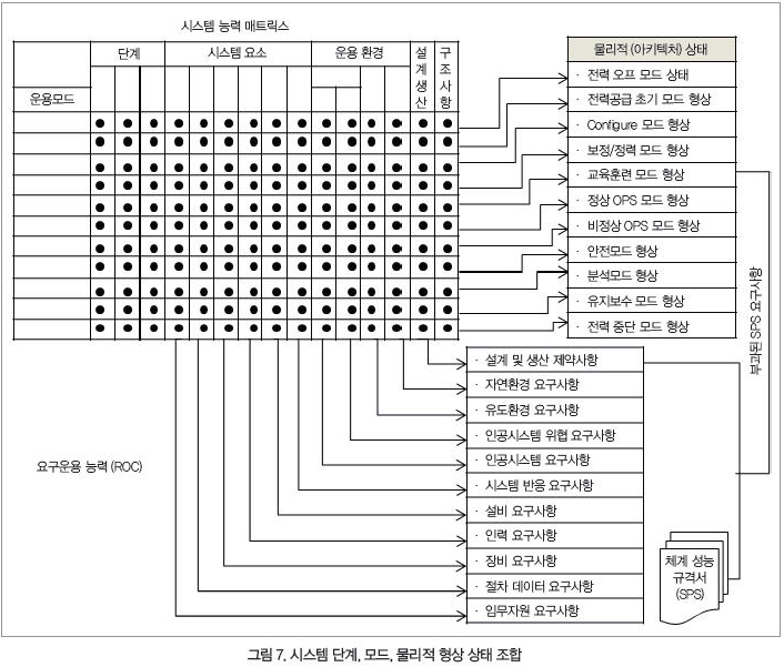 요약해서 그림 7은 운용 요구능력이 시스템 능력 매트릭스로부터 SPS로 어떻게 연결되는지를 보여준다. 그리고 후속적으로 각 운용모드에 대하여 시스템 아키텍처 물리적 운용상태에 의해 제공되고 할당되는지를 제시해 준다.