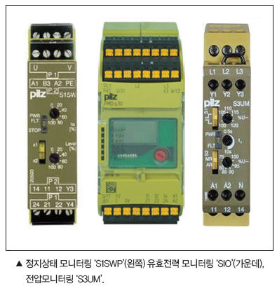 A.우선, 3상 공급 장치 전압 모니터링인 ‘S3UM’을 꼽을 수 있다. 이 제품은 10초까지 설정이 가능한 딜레이 타이머와 전원 및 이상 상태를 위한 LED가 내장되어 있다. 또한, 전압 모니터링, 비대칭 모니터링, 상 시퀀스 모니터링, 결상 검출 등 한 개의 제품에 4가지 기능이 탑재되어 있다. ‘S1MN’ 써미스터 모니터링 릴레이는 PTC 서미스터를 통해 모터 과열 보호를 위한 온도 모니터링, 엔진과 설비의 과열 직접 모니터링에 적합하도록 설계됐다. 그 외에도 ‘S1SW P’ 정지상태 모니터링을 들 수 있다. 이 제품은 정지상태를 모니터링하여 위험 요소의 검출이 가능하다. 주요 기능은 런다운 모니터링 시간 설정이 가능하며 로터리 엔코더 없이도 정지상태 모니터링을 할 수 있다. 뿐만 아니라 최대 1000Hz의 주파수 영역에서 최대 690v AC/DC 적용이 가능하다.