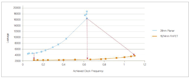 FinFET으로 개선된 성능은 벌크 대비 동일한 전력 공급에서 더 높은 주파수를 얻을 수 있다. 전력 감소는 두 가지 소스에서 비롯된다. 하나는 넓고 높게 드라이브해야 하는 스탠더드 셀의 필요성이 줄어든 것이고, 다른 하나는 낮은 공급 전압으로도 누설 전류가 제한적이 되었다는 것이다. 그러나 성능 개선을 완전히 실현하기 위해서는 설계 테크닉을 변경해야 한다.
