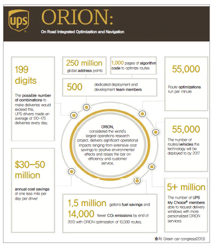 이는 현재에도 지속되고 있다. 포브스 지의 콘라드(Konrad)에 의하면, 오랜 구축 기간을 거쳐 2012년 오리온 베타 서비스를 시작한 UPS는 최적화된 루트 지도를 통해(그림 4 참조) 운송 거리 530만 마일 절감, 엔진 유휴 시간 1,000만 분 감소, 246만 리터 연료 절감, 탄소 배출량 6,500톤 이상 감소 등의 효용성 관련 효과를 얻게 되었다.
