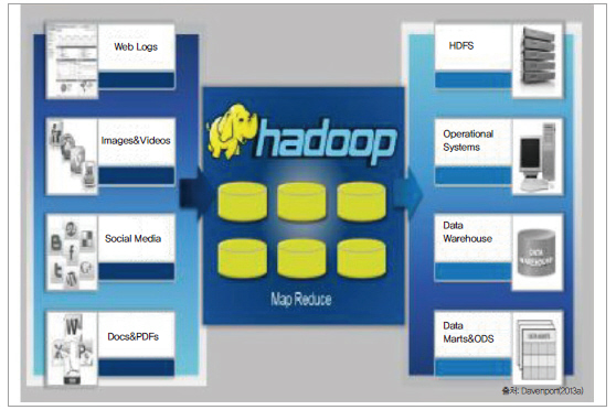 데이터 저장은 하둡을 실행하는 대규모 병렬 서버에 저장해 전반적인 분석 속도가 빨라졌고, 시각적 분석도 중요해지며, 데이터 과학자는 밀실 작업에 만족하지 않고, 점차 신제품 제공에도 참여하면서 비즈니스 운영에 일조하기 시작한다. 기술적으로 분석2.0 데이터 환경은 위의 그림 3과 같이 하둡 기반 비정형데이터 시대인 셈이다.