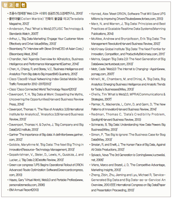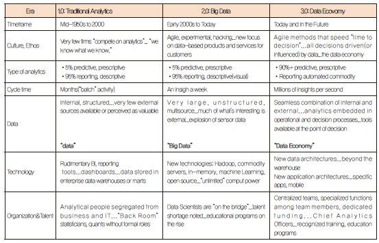 즉, 분석의 잠재성을 활용하고자 하는 업종이나 기업이면 누구나(은행, 제조업체, 보건의료 기관, 소매업체 등) 빅데이터를 활용해 고객을 위한 데이터 기반 서비스를 개발하고 내부 의사결정을 지원할 수 있게 되는 시기가 된다. 데이븐포트가 제시한 분석 1.0, 2.0, 3.0을 시기, 문화, 분석 유형, 데이터, 기술, 그리고 조직 및 역량별로 요약하면 표 1과 같다.