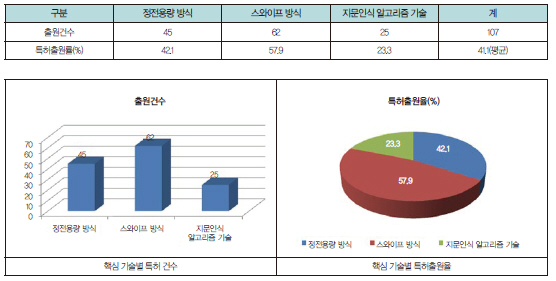 •‌지문인식 기술을 모바일기기에 적용하는 데 있어 중요한 성능을 발휘할 수 있는 132건의 핵심특허 세부내용은 정전용량 방식 45건, 스와이프 방식 62건, 지문인식 알고리즘 기술 25건으로 나타났다.