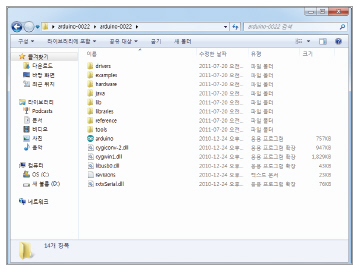 아두이노의 개발 환경은 그림 1과 같이 특별히 설치하는 형태가 아니라 다운로드 받아서 압축을 풀면 바로 실행시켜서 사용할 수 있는 형태로 구성되었다. 따라서 USB 메모리와 같은 저장 장치에 가지고 다녀도 되니 매우 가벼운 개발 환경이라고 하겠다.