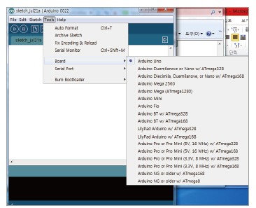 •보드 및 시리얼 포트 선택: 아두이노 통합 개발 환경에서는 여러 종류의 아두이노 보드를 지원할 수 있도록 구성되었다. 따라서 구입한 보드에 맞게 보드의 종류 및 이름을 선택해야 정상적으로 작성한 프로그램이 동작한다.