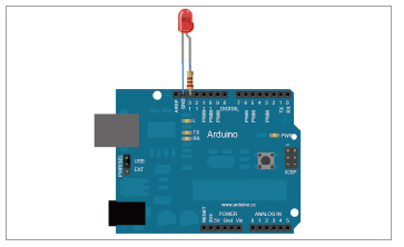 그림 3은 아두이노 보드에 LED를 실제로 연결하는 방법을 설명한 것이다. 이와 같이 아두이노는 손쉽게 하드웨어 부품을 연결하고 테스트 할 수 있는 구조로 하드웨어가 설계가 되었다. 이 연결한 LED를 프로그래밍 하는 방법은 리스트 1과 같다.