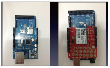 그림 4는 아두이노 메가 보드에 WiFi 연결 기능을 제공하는 WiFi 쉴드를 장착한 모습이다. WiFi 쉴드는 아두이노 보드에서 인터넷 연결 기능을 제공하며, 본 기능을 사용해서 스마트폰과 통신하는 기능을 구현할 수 있다. 스마트폰과 연결 방법은 ▲스마트폰과 직접 연결 ▲스마트폰과 인터넷 서비스를 통한 간접 연결 등을 고려할 수 있다.