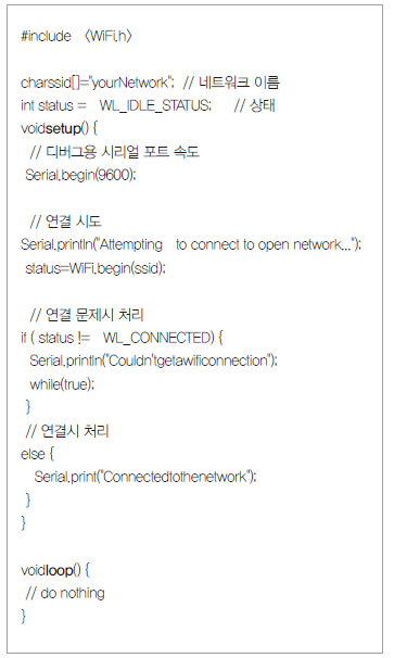 리스트 3은 아두이노와 WiFi 쉴드를 이용한 인터넷 연결 프로그램의 예다. 아두이노에서는 WiFi 연결에 관한 프로그램을 간단하게 작성할 수 있으며, 이 기능을 이용해 서버에 접속하는 기능을 구현하게 된다.