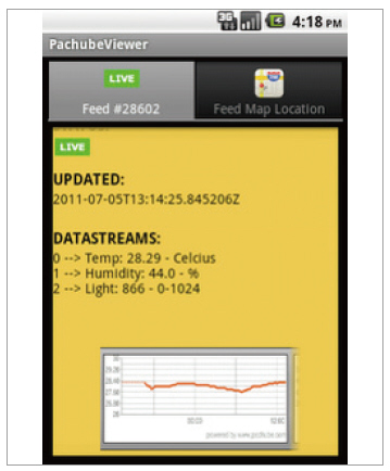 그림 7은 구글 앱 엔진을 통해 전달된 정보를 로깅하고 그래프로 보여준 화면이고, 그림 8은 스마트폰에서 아두이노 보드의 정보를 읽고 제어하는 그림이다. 물론 서버에 기록되어 있는 정보를 확인하고 필요한 명령은 서버를 통해 아두이도 보드로 전달하게 된다.
