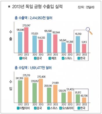 우리나라와 세계 시장에서 경쟁하고 있는 세계 5대 금형강국인 일본, 중국, 독일, 미국의 금형 수출입 실적을 조사한 결과, 지난해 우리나라 금형수출은 26억7,582만 달러로 세계 3위를 기록했다. 이는 2012년에 이어 2년 연속으로 세계 3위를 차지한 것으로, 최근의 엔저현상과 세계경제 위축 속에서도 우리나라 금형수출이 꾸준히 증가세를 이어가고 있다.
