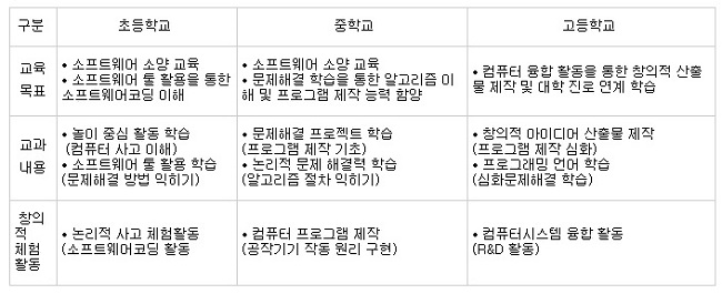 중학교에서는 현행 과학/기술·가정 교과군이 과학/기술·가정/정보 교과군으로 개편되고, 정보 과목이 필수 단독 과목으로 신설된다. 해당 교과군에 시수 34시간을 증배해 총 680시간이 배정된다. 늘어난 시수는 정보 과목에 할당되어 두 학기 동안 주당 한시간씩 소프트웨어를 학습한다는 것이다. 고등학교는 2018년부터 심화 선택인 정보 과목이 일반 선택으로 지정된다. 교육부에서 제시한 학교별 소프트웨어 교육 목표와 모형은 표 1과 같다.