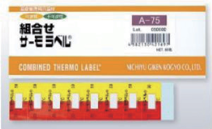 조합형 온도 라벨 A는 특정 온도에서 색이 변하지만 냉각하면 본래의 색으로 되돌아가 재사용이 가능한 온도 시트(Thermo Sheet)와 중앙에 온도를 표시하는 엘레멘트(온도 라벨)를 조합한 것이다. 중앙에 있는 온도 라벨은 엘레멘트에 의해 과거의 온도를 보여 주고, 베이스의 색깔이 변하면서 현재의 온도를 보여 준다.