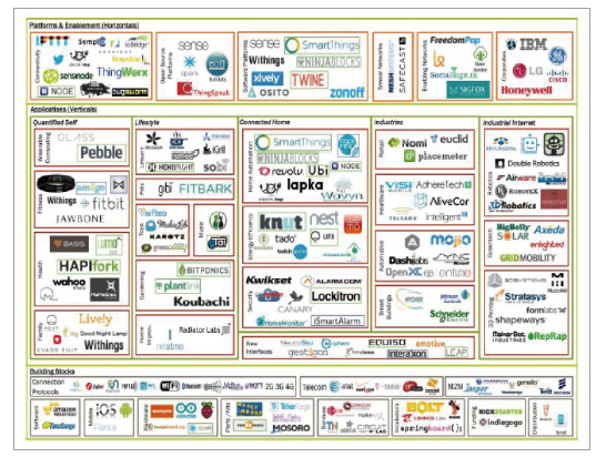 그림 1은 사물인터넷 기업들의 2013년 비즈니스 환경을 보여준다. 생태계의 수평축으로는 플랫폼 기업들이 걸쳐 있으며, 그 밑에 영역별로 수직적 앱들이 발달하고 있다. 이는 스마트폰 생태계에서의 플랫폼과 앱들로 구성된 개방형 생태계 모습과 유사하다.