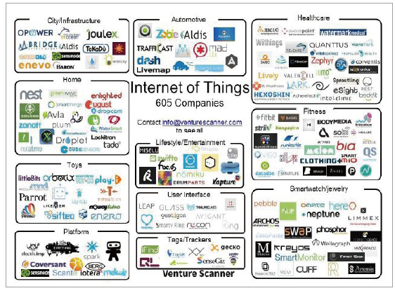 2013년 사물인터넷 생태계 환경은 모바일 및 소셜미디어 환경과 접목되는 양상을 보여주고 있다. 이는 인지 컴퓨팅이 진화하고 있음을 시사한다. 그림 5은 2014년 현재의 사물인터넷 생태계 환경이 도식화된 것이다. 벤처 스캐너가 605개의 사물인터넷 기업을 분석해 14개의 카테고리(Category : 범주)로 구분한 비즈니스 환경을 보여주고 있다. 2013년 생태계에서는 플랫폼과 앱으로 구분했던 것에 반해 2014년 생태계 환경에서는 특정 산업 영역이 부각되고 있다는 것을 알 수 있다.