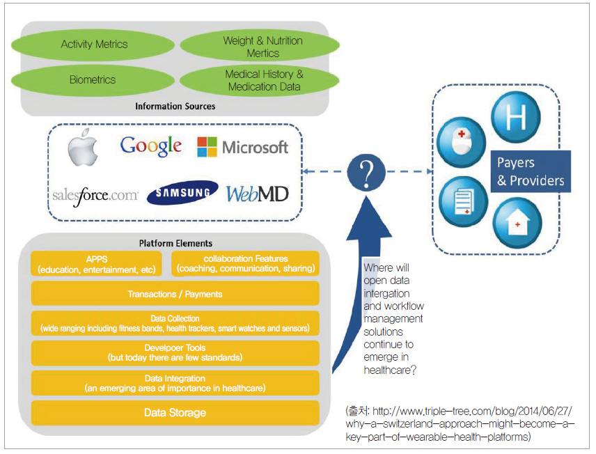 트리플트리라는 한 블로그에서는(2014년 6월 27일) 향후 사물인터넷 생태계에는 사물인터넷뿐만 아니라 헬스 관련 다양한 기업군들과의 협력이 필요한 스위스전략(Switzerland strategy)이 필요하다고 강조한다(그림 7).