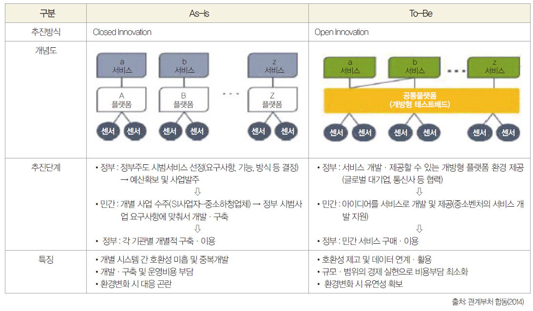 이 기본계획에서 주목할 부분은 글로벌 움직임에 나타난 개방형 생태계가 우리나라에는 아직 조성돼 있지 못하다는 현실이다. 폐쇄형과 개방형을 비교하면 표 1과 같다.