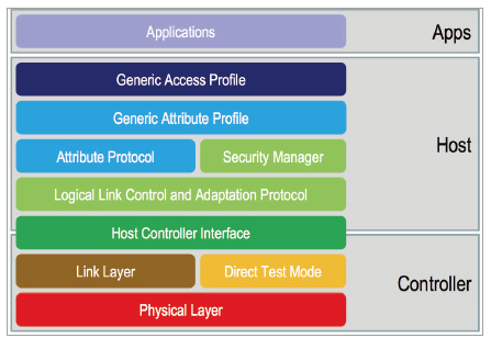 블루투스의 내부 구조(그림 5)는 물리적인 연결 영역(Physical Layer)과 연결 영역(Link Layer), 프로토콜의 보안을 담당하는 보완 매니저(Security Manager), 속성 프로파일(Generic Attribute Profile), 접근 프로파일(Generic Access Profile) 등으로 구성돼 있다. 그중 블루투스 4.0에서는 속성 프로파일과 접근 프로파일이 중요한 역할을 담당한다.