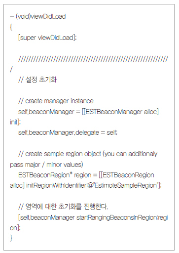 리스트3은 실제적인 위치를 표시해 주는 루틴(특정한 작업을 실행하기 위한 일련의 명령)을 나타낸 것이다. 위치표시에 있어서 가장 중요한 부분은 비콘에서 전달된 수신 신호 감도(RSSI)를 이용해 비콘과 아이폰과의 상대 거리를 계산하는 것이다.