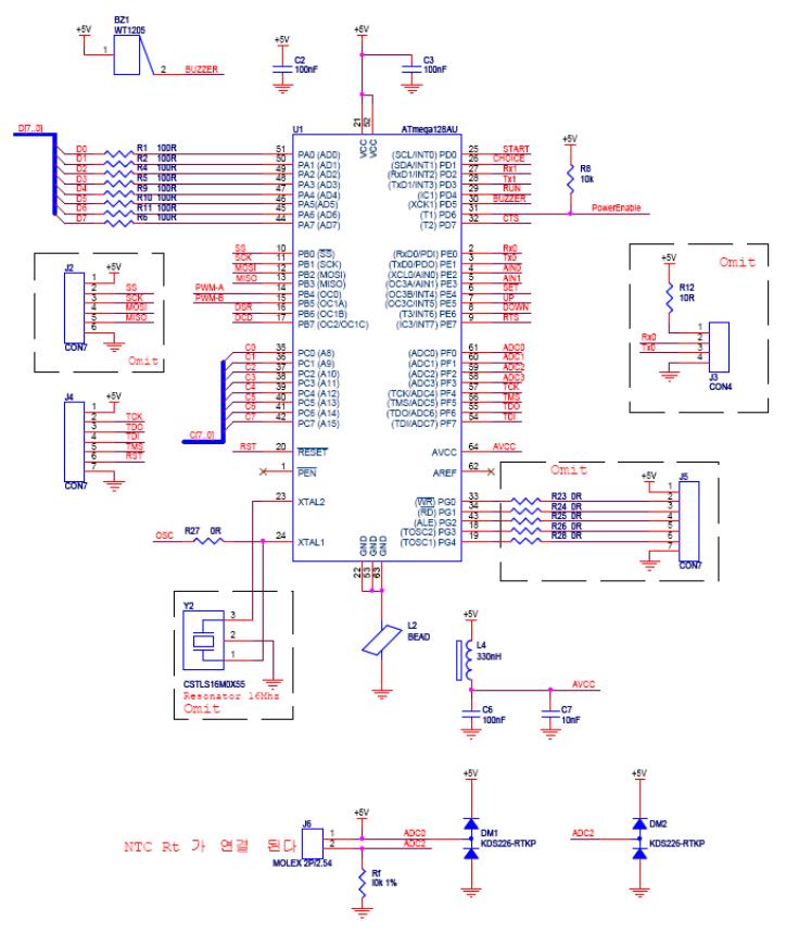 그림 5에서 위치번호 J6으로 표현된 곳에 써미스터가 연결된다. ATMega128에 내장된 10bit ADC를 이용한 써미스터의 변화된 저항값을 전압으로 디지털 변환해 읽어 온다.