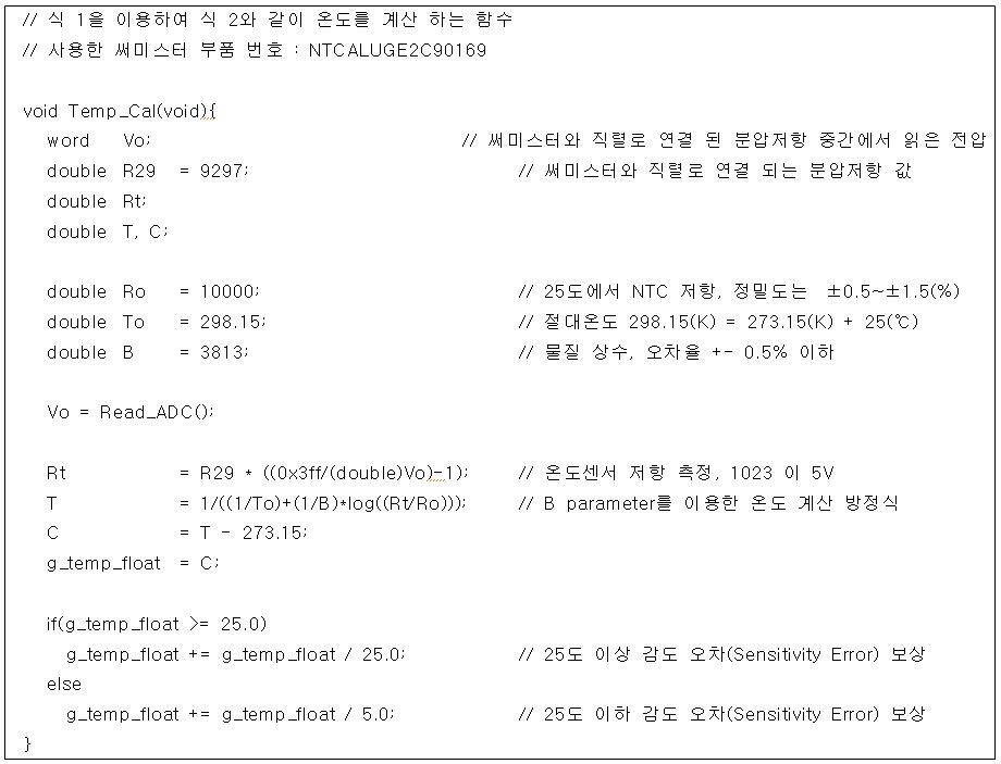NTC 온도 측정을 위해 사용된 마이크로프로세서는 8bit로 많은 사용자를 가지고 있는 ATMEL의 ‘ATMega128’이며, 소스 코드를 다른 마이크로프로세서에 이식해 적용하는 것은 쉬울 것으로 판단된다. 핵심 코드는 Temp_Cal() 이며, 온도에 따른 써미스터의 저항 변화를 AD를 통해 전압으로 읽어 들이고, 이러한 전압을 특별한 공식을 이용해 온도 값으로 연산하고 표시한다.