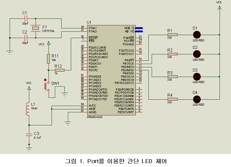 비교적 간단한 LED 제어에 대한 회로는 그림 1과 같다. 이 회로에서 PORT에 직접 LED가 연결되어 있으며, 스위치를 이용하여 선택적인 동작을 할 때는 Buffer IC(74HC244)를 사용할 수도 있다. LED는 Active Low 방식으로 구동된다.