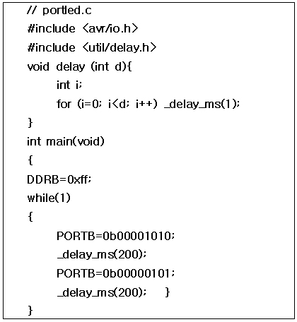 Makefile을 만든 후 WinAVR->Programmers Notepad를 실행하여 소스 코드를 작성한다. 그리고 그 파일 이름을 portled.c라고 저장한다. 그런 후 메뉴 Tools->WinAVR[make all]을 눌러 실행한다. 만약 Process Exit Code : 0이 나왔다면 프로그램이 에러 없이 잘 실행된 것이다. 그리고 WinAVR2010의 Programmers Notepad에서 C언어로 프로그래밍을 한다. 또는 AVR Studio 4에서 직접 코드를 작성하고 컴파일을 해도 되지만, Programmers Notepad가 컴파일 시간이 더 빠르다.