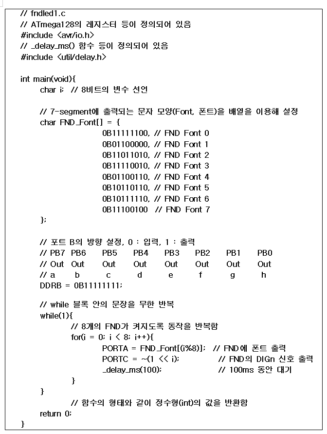[예제 2] 이 프로그램은 8개의 FND에서 맨 오른쪽 FND부터 좌측으로 움직이면서 0, 1, 2, 3, 4, 5, 6, 7이 차례로 켜지는 것이다. FND 디스플레이의 제어 동작을 확인하기 위해 대기시간을 100ms로 하였다.