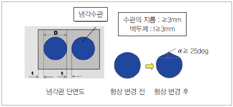 ⑤ 금형 내부의 냉각통로와 같은 절삭가공으로는 제작이 어려운 형상을 제작할 수 있지만, 설계상 형상을 보완할 필요가 있다. 예를 들면 형상 적응형 냉각터널을 적층조형 방식으로 냉각 채널을 제조할 경우, 자유로운 냉각회로를 어느 곳에서나 설치할 수 있고 코어와 캐비티 형상에 가장 적합하게 냉각수 통로를 제작하여 삽입시킬 수 있으며 균일한 냉각온도 분포로 제품의 휨을 최소화시킬 수 있는 장점이 있다.