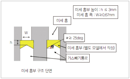 미세 홈부 구조의 높이는 가스빼기를 원활하게 하기 위해 3mm 이하로 한다. 성형 시 수지가 막히는 것을 고려하여 미세 홈부는 교환 가능한 부품으로 하는 것이 바람직하다.
