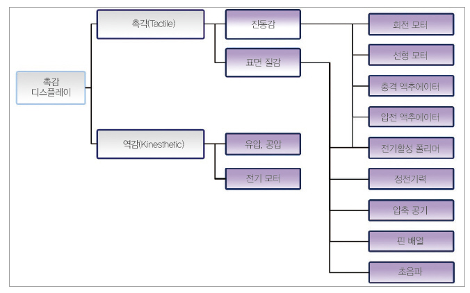촉감 디스플레이 기술은 그림 1과 같이 분류할 수 있다. 촉감 디스플레이는 다시 촉각(Tactile) 디스플레이와 역감(Kinesthetic) 디스플레이로 나뉜다. 촉각과 역감은 사람이 촉감을 느끼는 수용기(일종의 센서)에 따라 분류한 것이다.
