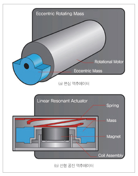 초기에는 편심 회전모터[그림 2(a)]를 이용해 나타냈으나 강한 진동을 생성할 수 있는 반면 응답속도가 200ms 정도로 느리고 진동의 진폭과 주파수를 독립적으로 제어할 수 없다는 단점이 있었기 때문에 선형공진 액추에이터(Linear Resonant Actuator)로 교체됐다[그림 2(b)].