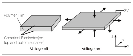 전기활성 폴리머(Electroactive Polymer, EAP)는 높은 유전율(High Dielectric Constant, high-k)을 갖고 있어 고전압을 견딜 수 있는 폴리머로, 그림 4와 같이 폴리머 양면에 전극을 형성하며 전압을 가해주면 정전기력에 의해 폴리머가 압축되면서 힘을 발생시킨다.