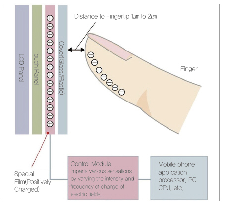 그림 6과 같이 터치 패널 위에 양전하로 충전된 필름을 놓고 보호층(유리 또는 플라스틱 필름)으로 덮은 다음, 음전하로 충전된 손가락으로 보호층을 접촉하면 사람의 피부와 양전하로 충전된 필름 사이에 인력이 작용한다. 전류를 펄스 형태로 가해주면서 손가락을 문지르면 질감이 느껴진다.