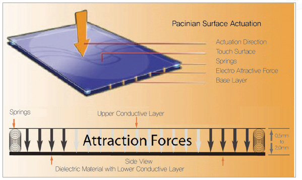 이와 같은 단점을 보완하기 위해 Pacinian사는 그림 7과 같이 양쪽에 0.5mm∼2.0mm 간격으로 도전층을 두고 전압을 가해 발생하는 정전기력(인력)을 사용한다. 양 도전층 사이에는 스프링이 있어 상부 도전층을 지지하고 복원력을 제공하며, 하부 도전층 위에는 고유전체막이 있어 더 큰 힘을 낼 수 있도록 설계했다.