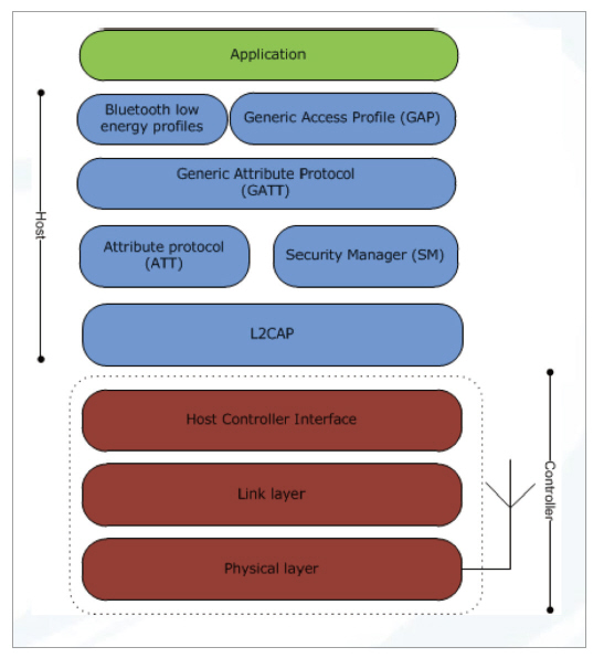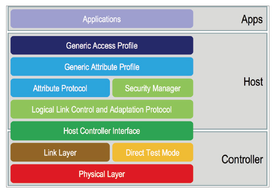 블루투스는 <그림 1>와 같은 내부 소프트웨어 구조로 구성된다. 물리적인 연결 영역(Physical Layer), 연결 영역(Link Layer), 프로토콜의 보안을 담당하는 보완 매니저(Security Manager), 속성 프로파일(Generic Attribute Profile), 접근 프로파일(Generic Access Profile) 등이 있다. 그 중에서도 속성 프로파일과 접근 프로파일이 블루투스 4.0의 중요한 역할을 담당한다.