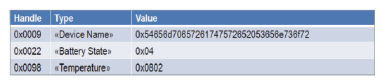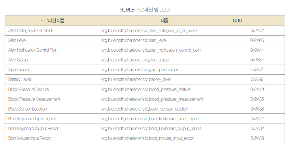우선 사용자 정의 프로파일은 속성 프로토콜(ATT, Attribute Protocol)을 통해 어떤 정보를 전달할 것인지에 대한 정보를 교환한다. <그림 3>은 온도계 정보에 대한 정의로, 온도계 정보를 정의하기 위한 UUID(universally unique identifier), 배터리의 잔량을 알려주는 배터리 상태, 그리고 온도에 대한 정보 등으로 구성됐다.