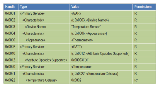 앞서 설명한 온도계 프로파일은 속성 정의 프로파일(Generic Attribute Profile)의 세부 정의에 의해 구현된다. 이 프로파일을 통해 초기에 스마트폰과 장치가 통신할 때 어떤 정보가 전달될 것인지 확인되며, 정보 또한 전송/수신된다.