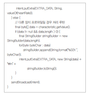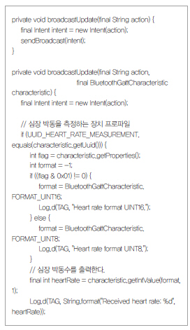 다음 소스인 broadcastUpdate 매소드는 GATT 연결 후 세부적으로 어떠한 속성을 가진 장치인지 확인하는 내용이다.