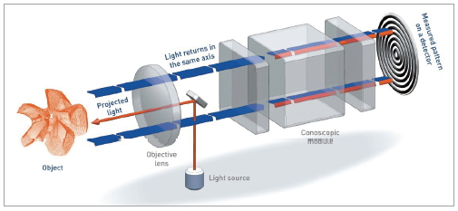 Conoscopic module은 편광기 두개와 공유의 Criystal로 구성되어 있으며, 편광기를 통과하면 물체의 고유의 빛이 원래의 빛과 굴절돼 두개로 갈라지고, 이로 인해 속도 및 위상차가 발생한다. 이 빛이 크리스탈과 2번째 편광기를 통과하면 동일한 속도의 간성패턴이 만들어지고, 이를 이용해 물체의 높이를 계산하는 원리이다.
