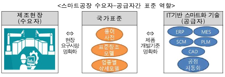 국가기술표준원은 이를 위해 스마트공장 개념과 핵심가치를 구체화하는 국가 표준을 개발하고 표준용어와 스마트공장 구축 참고 모델을 제공해 스마트공장 수요자․공급자 간 부조화를 최소화할 계획이다. 또한 기기·시스템·공장간 상호호환성을 확보하는 표준을 제조현장에 제시하고, 표준화 이행안을 개발해 국제표준 선점 방안도 마련했다.