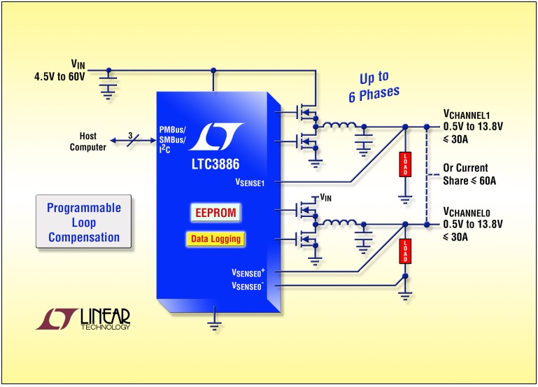 LTC3886은 2와이어 직렬 인터페이스를 탑재하고 있어 순차적 지연 시간을 두고 프로그램할 수 있는 슬루레이트로 출력 마지닝, 조정 및 증감이 가능한 것이 특징이다. 입출력 전류 및 온도와 함께 입출력 전압 데이터는 읽기가 가능하다. 이 디바이스는 빠른 듀얼 아날로그 제어 루프, 정밀 혼성 신호 회로 및 EEPROM으로 구성되어 있으며, 7mmx8mm QFN-52 패키지 형태로 제공된다.