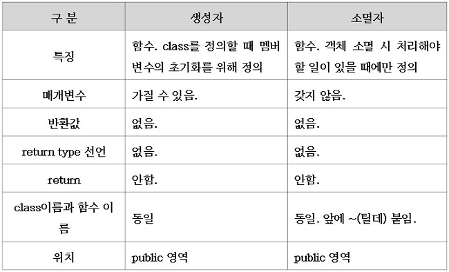 객체를 생성할 때 구체적인 초기화가 필요하다면 프로그래머는 생성자를 직접 만들 어야 한다. 또한 클래스 생성자를 인자로 받는 형태로 프로그래밍 했을 때 프로그래머가 이 클래스의 객체를 생성하면서 전달인자를 넘기지 않으면 컴파일러는 “일치하는 생성자가 없다”는 메시지를 보낸다. 이 때는 빈 공백의 생성자를 만들어 넣어야 한다. 그리고 소멸자에 있어서 사용자가 정의하지 않으면 컴파일러가 자동으로 생성한다. 그런데 생성자를 클래스 내부에서 정의해 선언했다면 소멸자도 반드시 정의해야 한다.