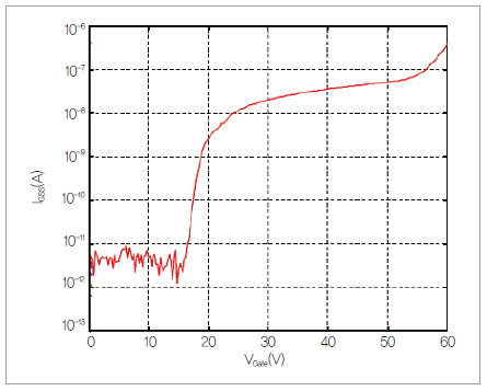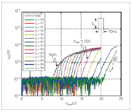 그림 2는 IGSS 수치가 높은 문제가 있는 CC-MOSFET의 I-V 특성을 보여준다. 더 나아가 지배적인 누설 경로를 분리하기 위해, I-V 특성은 DUT 상에서 수행했다.