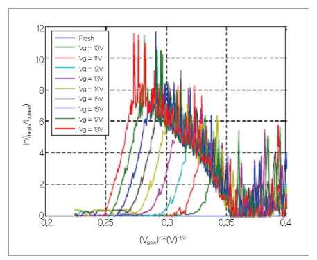 더불어 포획된 전하에서 발생하는 배리어 높이의 변형에 기인하는 이러한 거동을 모델링했다. 프렌켈-풀 이동 메커니즘을 가정해 게이트 펄스들과 포획된 전하 밀도량을 연결하는 이 모델을 충족할 수 있었다. 폴리옥사이드에 포획된 전하의 양을 정량화하면, n+ 폴리실리콘 상에 산화막층 성장의 절연 품질을 측정할 수 있다.