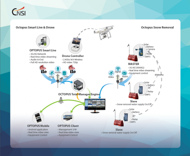 Octopus Snow removal Solution은 LTE를 사용하여 도로 또는 골목길의 적설량을 확인(카메라 영상)하고 제설이 필요할 경우 스마트폰 또는 윈도우 소프트웨어로 제설 시스템을 구동할 수 있다. 원격 네트워크는 이동통신망(LTE, WCDMA 등)으로 구성하고 Master & Slave 간에 RF400Mhz의 자가 무선 네트워크망을 형성한다.