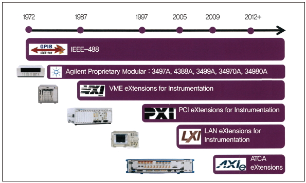 모듈러 형태의 계측장비들은 제품마다 표준을 접목하며 많은 변화를 겪어왔다. 그중 하나가 VXI(VME eXten-sion for Instruments) 타입이다. VME 버스는 원래 PC의 각 보드에 연결하는 버스 표준으로 개발됐으나, HP사에서 VME 버스를 계측기에 사용하고자 VXI 표준을 만들었다. 1970년대 후반, VXI 버스 컨소시엄 멤버에는 키사이트, NI, 테라다인이 참여했다.